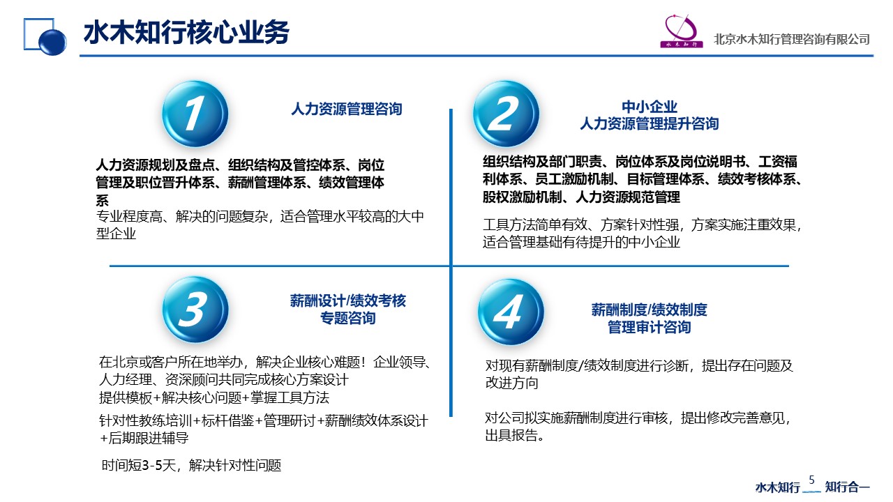 北京水木知行管理咨詢有限公司(www.bjsmzx_com.3rqp.com)專注提供人力資源管理咨詢、人力資源管理培訓、人力資源招聘咨詢、人力資源獵頭服務業務;咨詢業務范圍包括組織結構與管控體系、崗位管理體系、薪酬管理體系、績效管理體系,咨詢形式包括全過程咨詢、教練式咨詢和特訓班;培訓業務包括企業基礎管理...[詳情]
